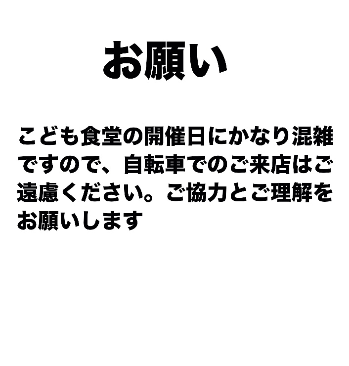 こども食堂の開催日に大変多くの子供さんがご来店のため、かなり混雑です。そのため、自転車でのご来店はご遠慮をお願いします。