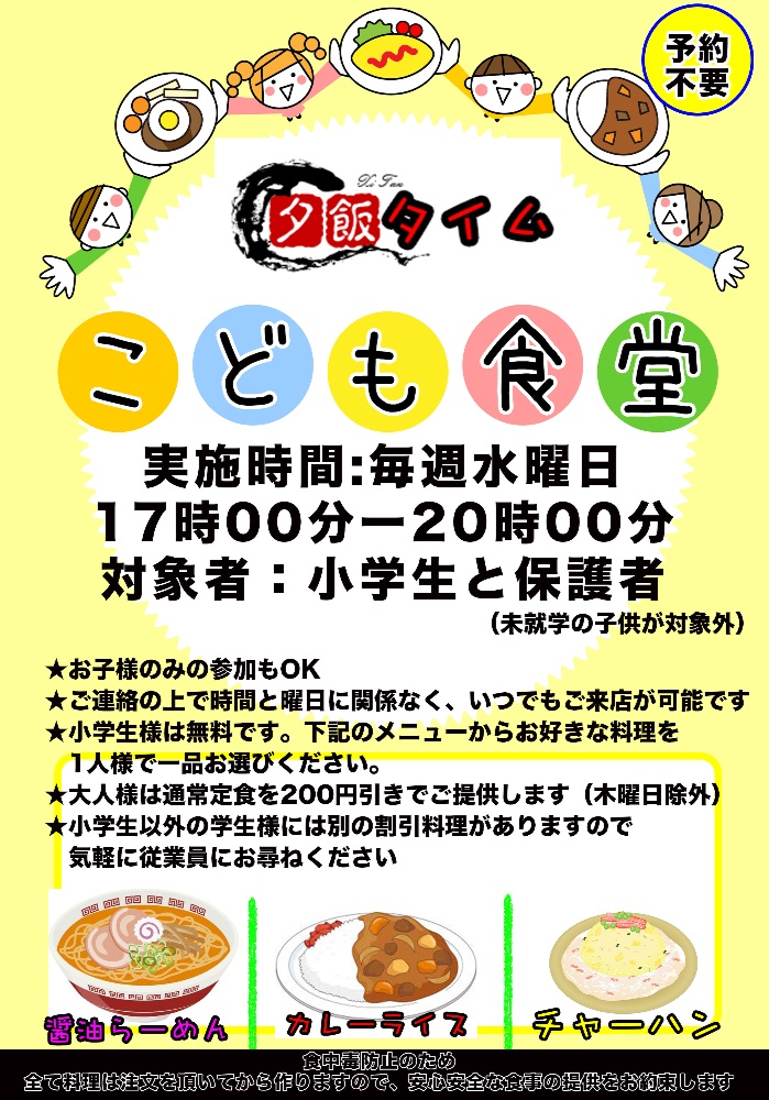 そして、より多い子供達や保護者様が利用し易いように、今回の夏休みは予約なしでご来店が可能ですが、混雑な場合はお待ちいただく場合があります。注文してから調理しますので、おまち頂く場合があります。昼ごはんの提供時間は12時半〜13時半です、そのた時間帯(11時半〜12時半と13時半〜14時)にご来店の場合は必ずお電話ください